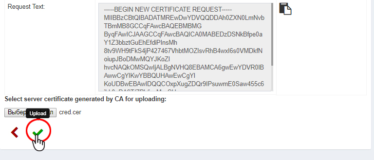- Вставьте запрос в текстовый файл и отправьте запрос в используемый УЦ. Получите от УЦ подписанный сертификат в формате шифрования DER или PEM.