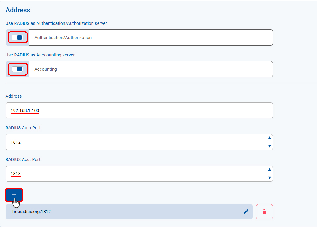 Наименование параметра Пример значения Описание Address freeradius.org (или IP-адрес внутри сети) Адрес RADIUS-сервера RADIUS Auth port 1812 Порт назначения для аутентификации и авторизации RADIUS Acct port 1813 Порт назначения при учёте - Нажмите