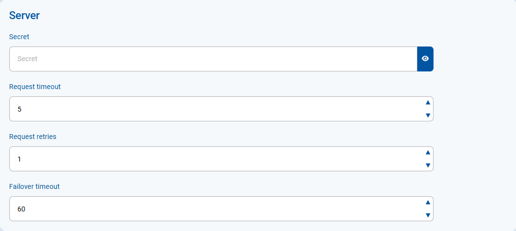 – нажмите для просмотраRequest timeout 5 Ограничение времени запроса, в секундах Request retries 2 Количество повторных запросов перед ошибкой Failover timeout 60 Время задержки перед отключением, в секундах -
