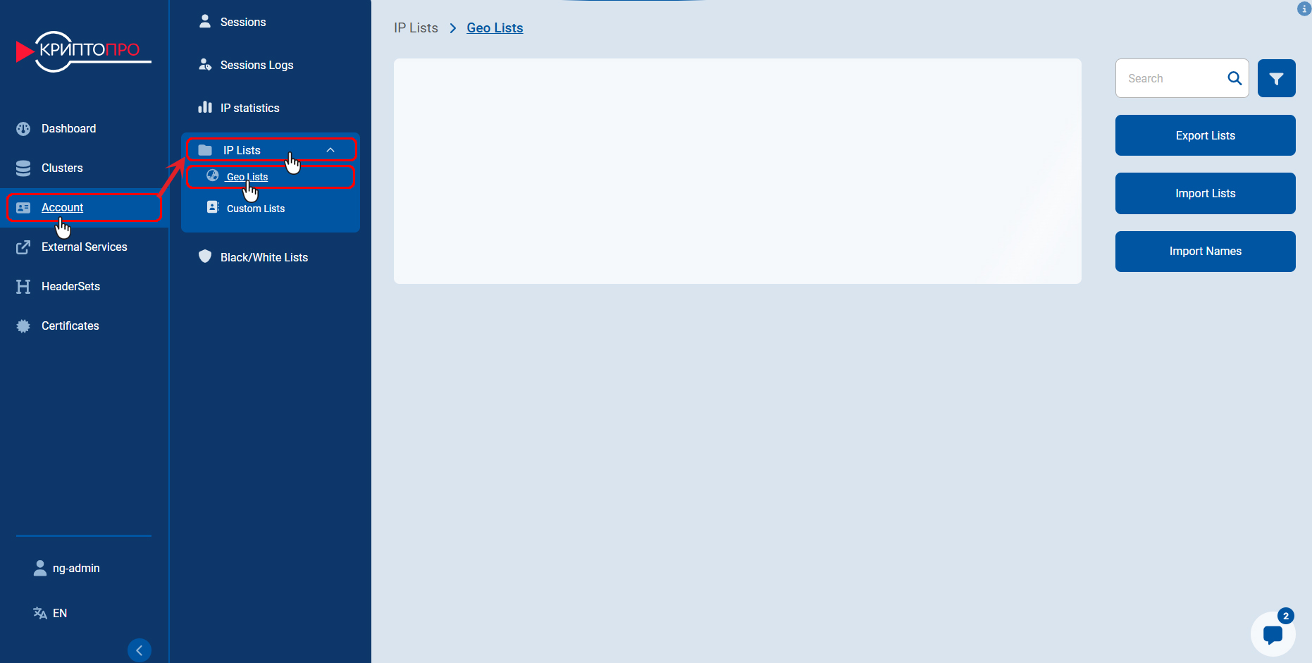 В NGate есть функция настройки конфигурации с возможностью разграничения доступа по наборам IP-адресов. Наборы адресов должны быть введены в систему перед настройкой политик. Ниже приведено описание процесса экспорта и импорта списков GeoIP, а также импорт имён.