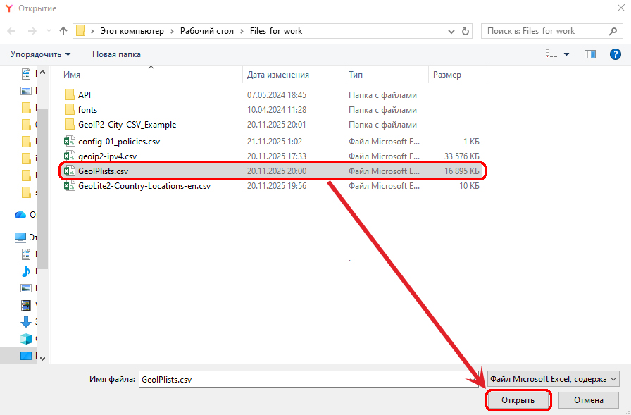 В открывшемся диалоговом окне выберите файл с набором IP-адресов с привязкой по